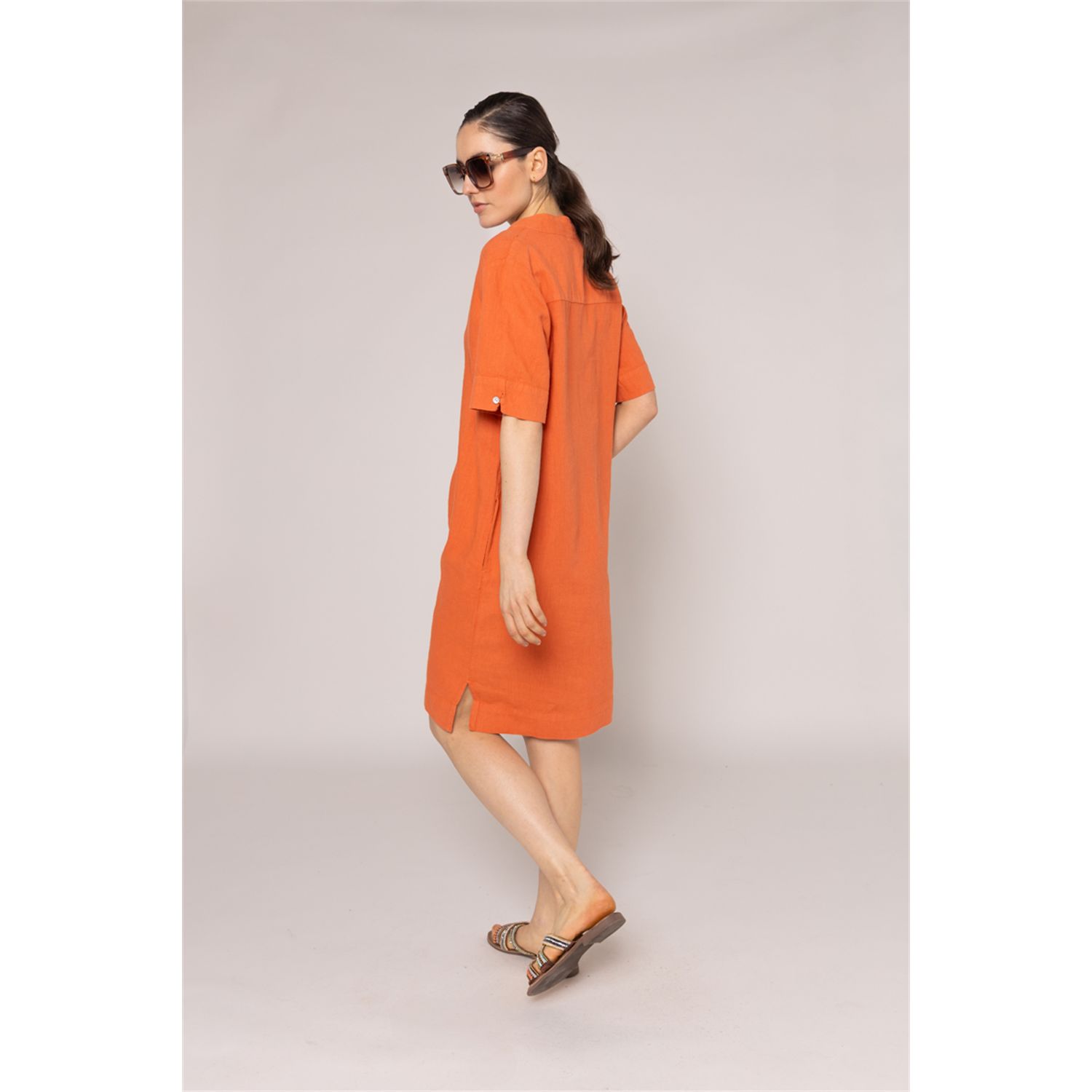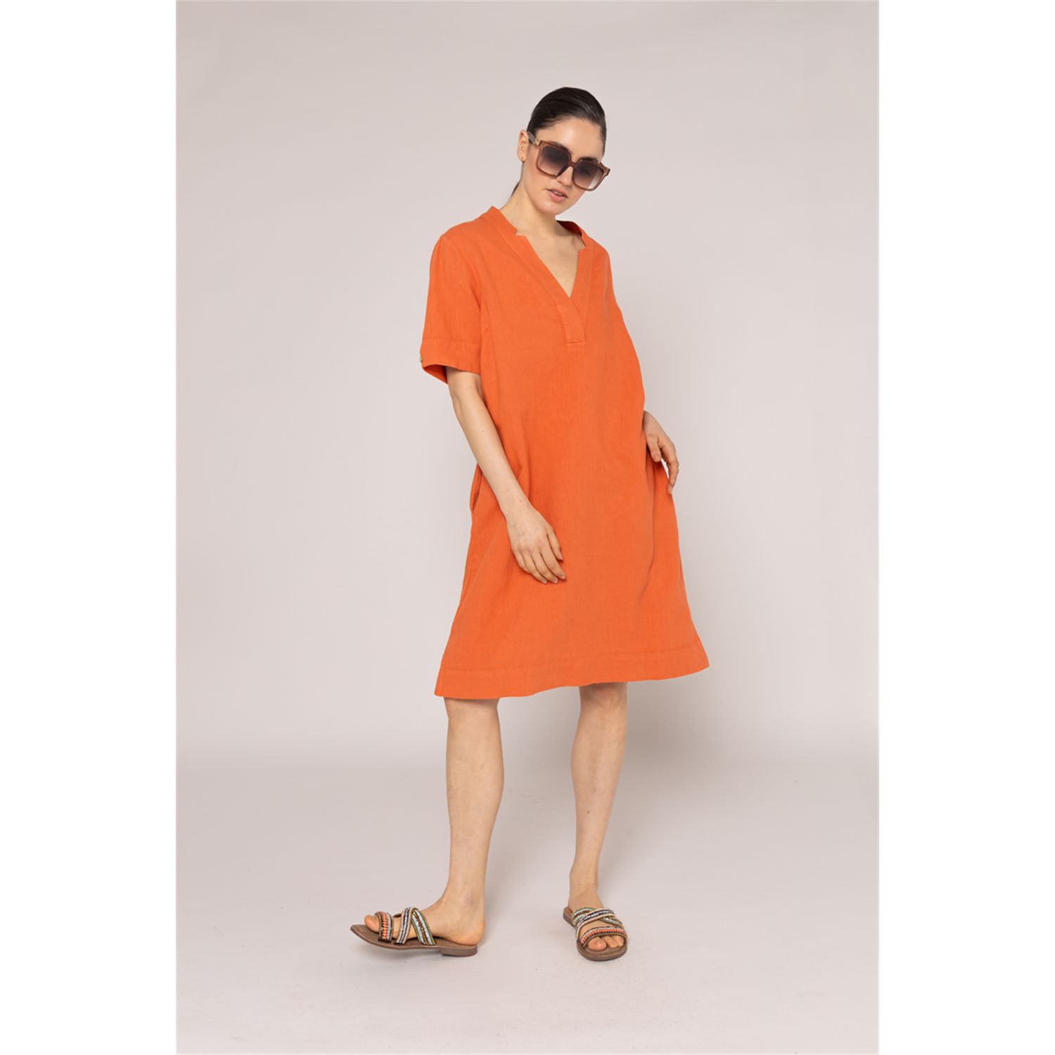 Sporty dress with fancy V neckline cutout, and short sleeve in linen/cotton blend