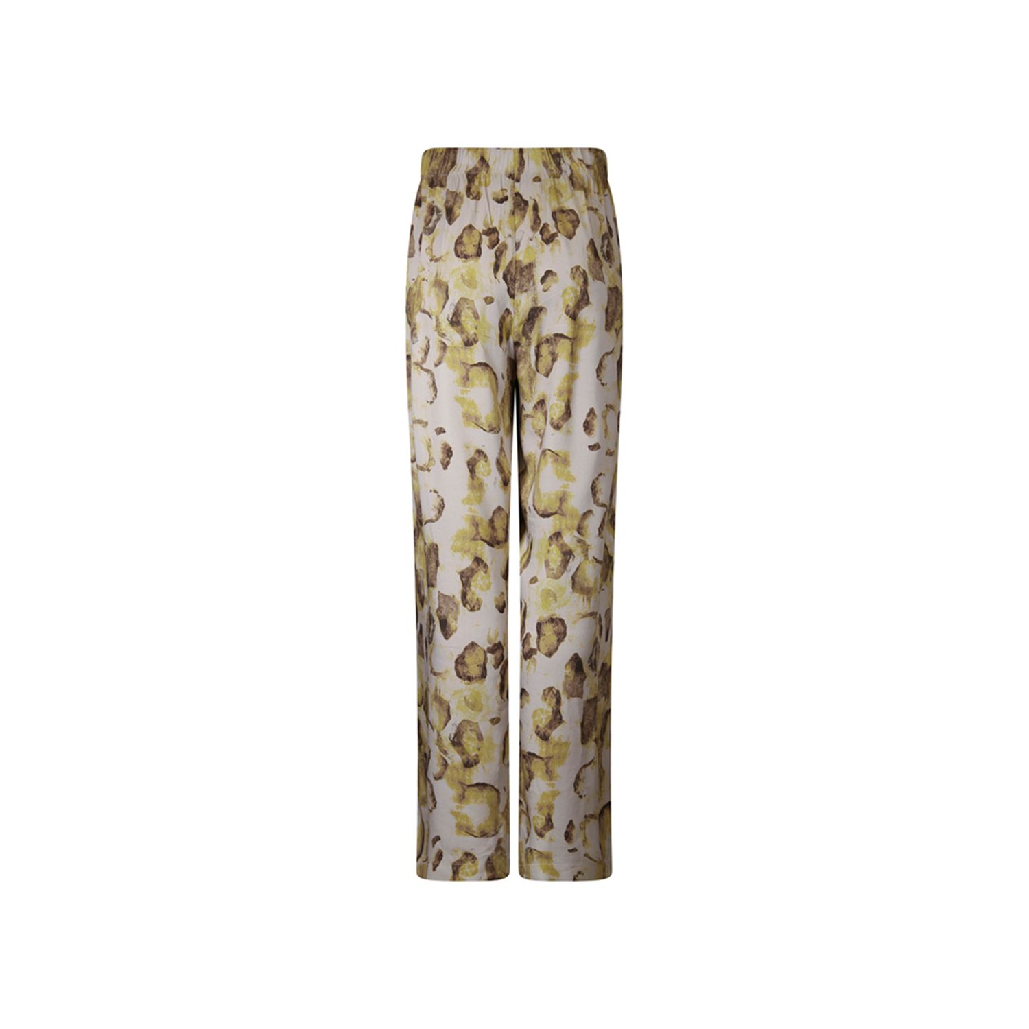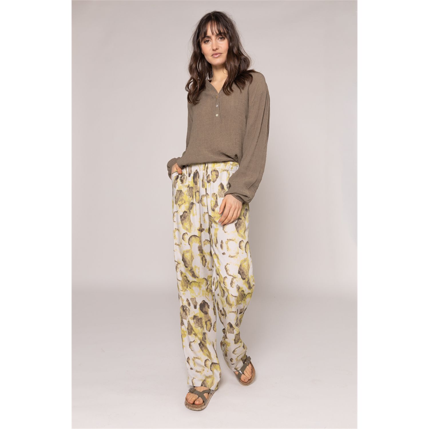Ruimvallende pants in natuurlijke print op soepele viscose met linnen-uitstraling